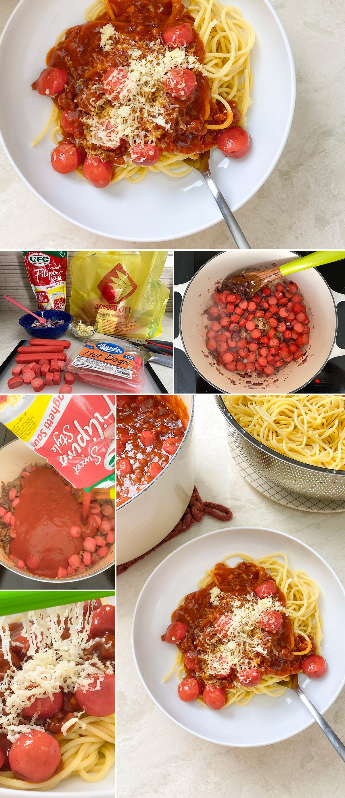 注:如果找不到菲律宾甜味意粉酱,可以用普通番茄酱代替并加糖。糖的用量取决于您的口味,所以可以先少量添加,直到达到您想要的口味为止。